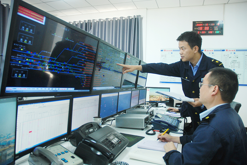 圖為湖集中心站行車室主任王迪現(xiàn)場盯控運(yùn)輸組織作業(yè)