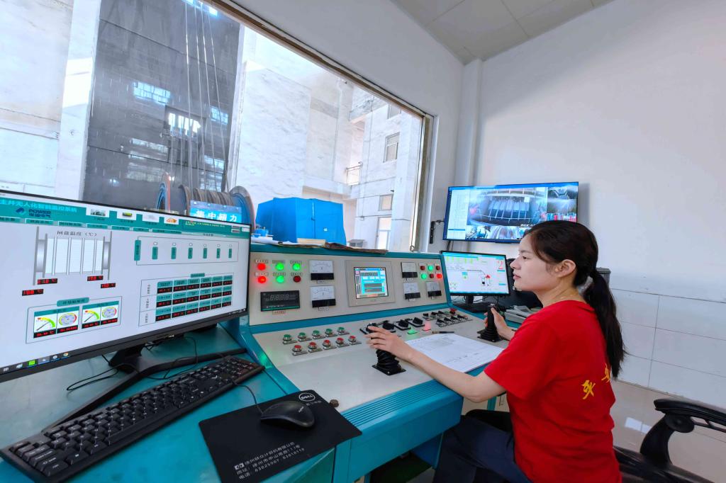 圖為保運(yùn)區(qū)絞車司機(jī)董平正在操作運(yùn)行主井絞車