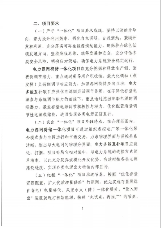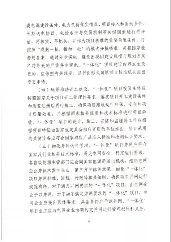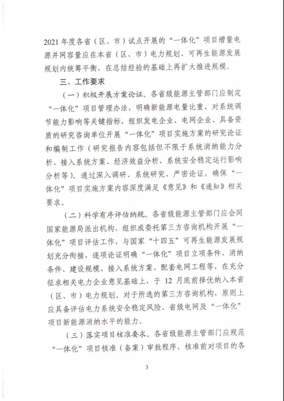 工作要求:積極開(kāi)展方案論證。科學(xué)有序評(píng)估納規(guī)。落實(shí)項(xiàng)目核準(zhǔn)要求。統(tǒng)籌推動(dòng)開(kāi)工建設(shè)。細(xì)化并網(wǎng)運(yùn)行管理。優(yōu)先推進(jìn)鄉(xiāng)村振興項(xiàng)目。鼓勵(lì)重大創(chuàng)新示范。在上述工作要求中,《通知》要求,各省級(jí)能源主管部門應(yīng)開(kāi)展“一體化”項(xiàng)目評(píng)估工作,與國(guó)家“十四五”可再生能源發(fā)展規(guī)劃充分銜接,逐項(xiàng)論證明確“一體化”項(xiàng)目立項(xiàng)條件、消納條件、建設(shè)規(guī)模、接入系統(tǒng)方案、配套電網(wǎng)工程等,在充分征求相關(guān)電力企業(yè)意見(jiàn)基礎(chǔ)上,于12月底前擇優(yōu)納入本省(區(qū)、市)電力規(guī)劃。