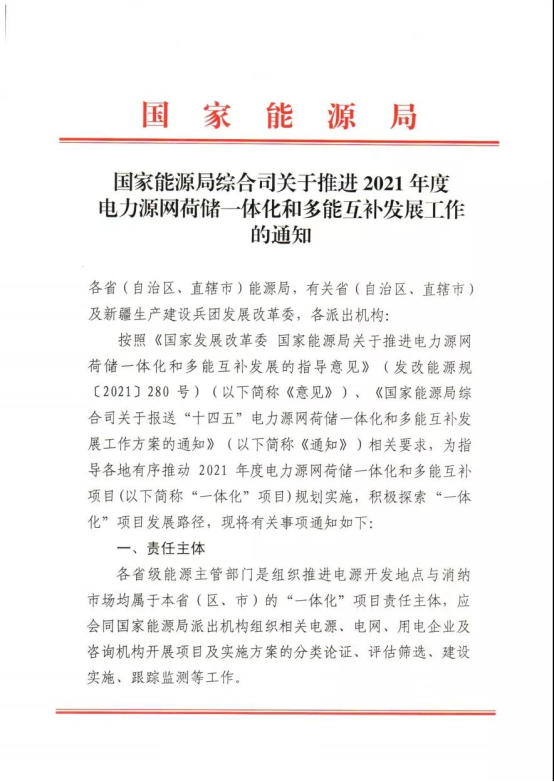 11月10日,國(guó)家能源局發(fā)布《關(guān)于推進(jìn)2021年度電力源網(wǎng)荷儲(chǔ)一體化和多能互補(bǔ)發(fā)展工作的通知》。