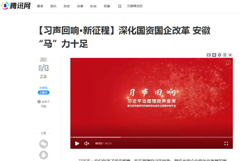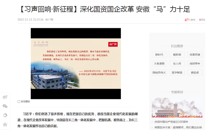 搶抓發(fā)展機(jī)遇,敢為時(shí)代先鋒。國(guó)企改革三年行動(dòng)以來(lái),安徽國(guó)資國(guó)企深化改革創(chuàng)新,不斷轉(zhuǎn)型突破,推動(dòng)省屬企業(yè)高質(zhì)量發(fā)展邁上新臺(tái)階。2021年,安徽省屬國(guó)有企業(yè)經(jīng)營(yíng)業(yè)績(jī)創(chuàng)歷史最好水平。今年上半年,省屬企業(yè)資產(chǎn)總額首次突破2萬(wàn)億元。目前,安徽省國(guó)企改革三年行動(dòng)的129項(xiàng)重點(diǎn)任務(wù)已基本完成。央廣網(wǎng)、人民網(wǎng)、中國(guó)網(wǎng)、中華網(wǎng)、光明網(wǎng)、環(huán)球網(wǎng)、中國(guó)經(jīng)濟(jì)網(wǎng)、中國(guó)青年網(wǎng)、中青在線、新浪網(wǎng)、網(wǎng)易網(wǎng)、騰訊網(wǎng)、搜狐網(wǎng)、鳳凰網(wǎng)等15家全國(guó)主流媒體及30余家省級(jí)主流媒體對(duì)此進(jìn)行了集中報(bào)道。