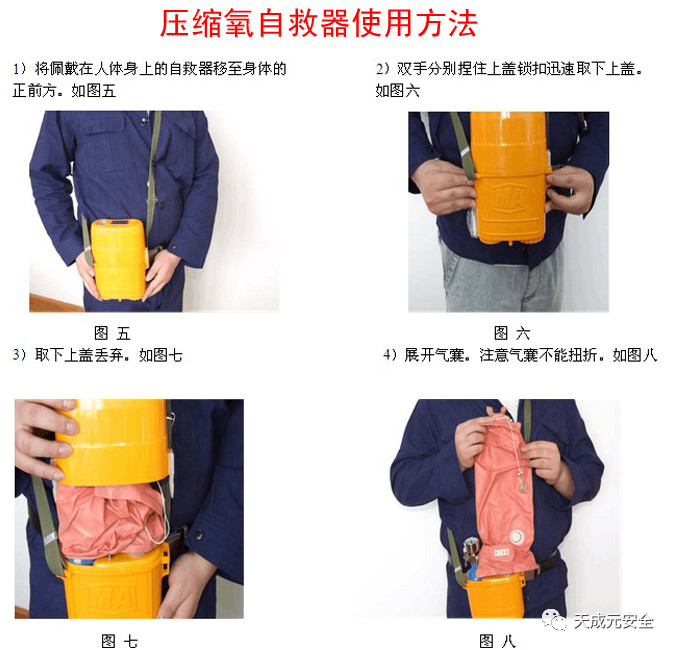 1)佩戴時將自救器移至右前方,左手拖住自救器底部,右手打開保護套,用大母指用力搬開開啟扳手;