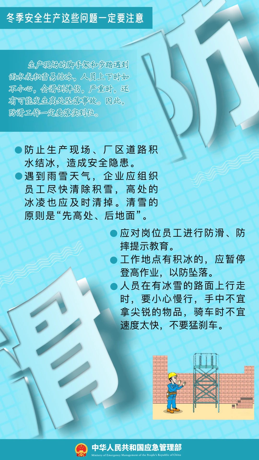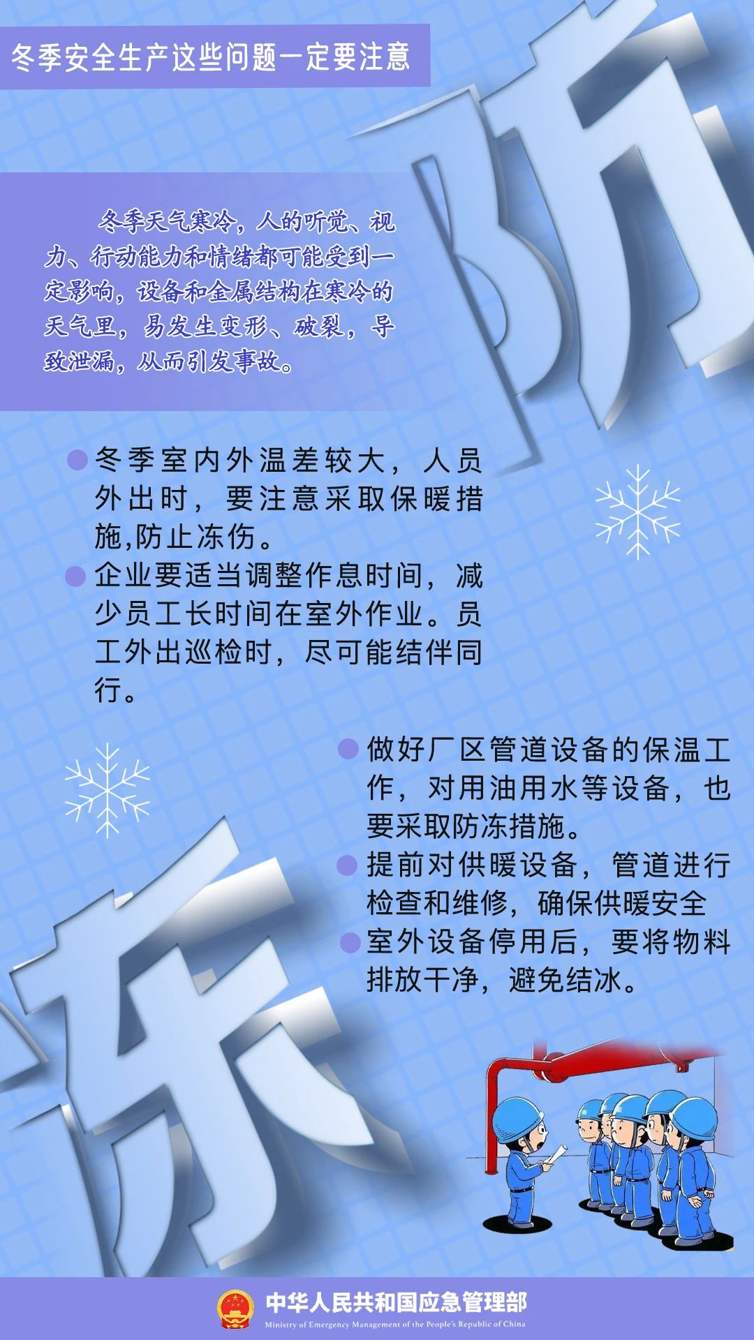 冬季寒冷、干燥,容易發(fā)生凍傷、中毒、滑跌等人身傷害事故,給企業(yè)安全生產(chǎn)帶來影響。冬季安全生產(chǎn)要注意哪些問題?一起學(xué)習(xí)↓↓↓